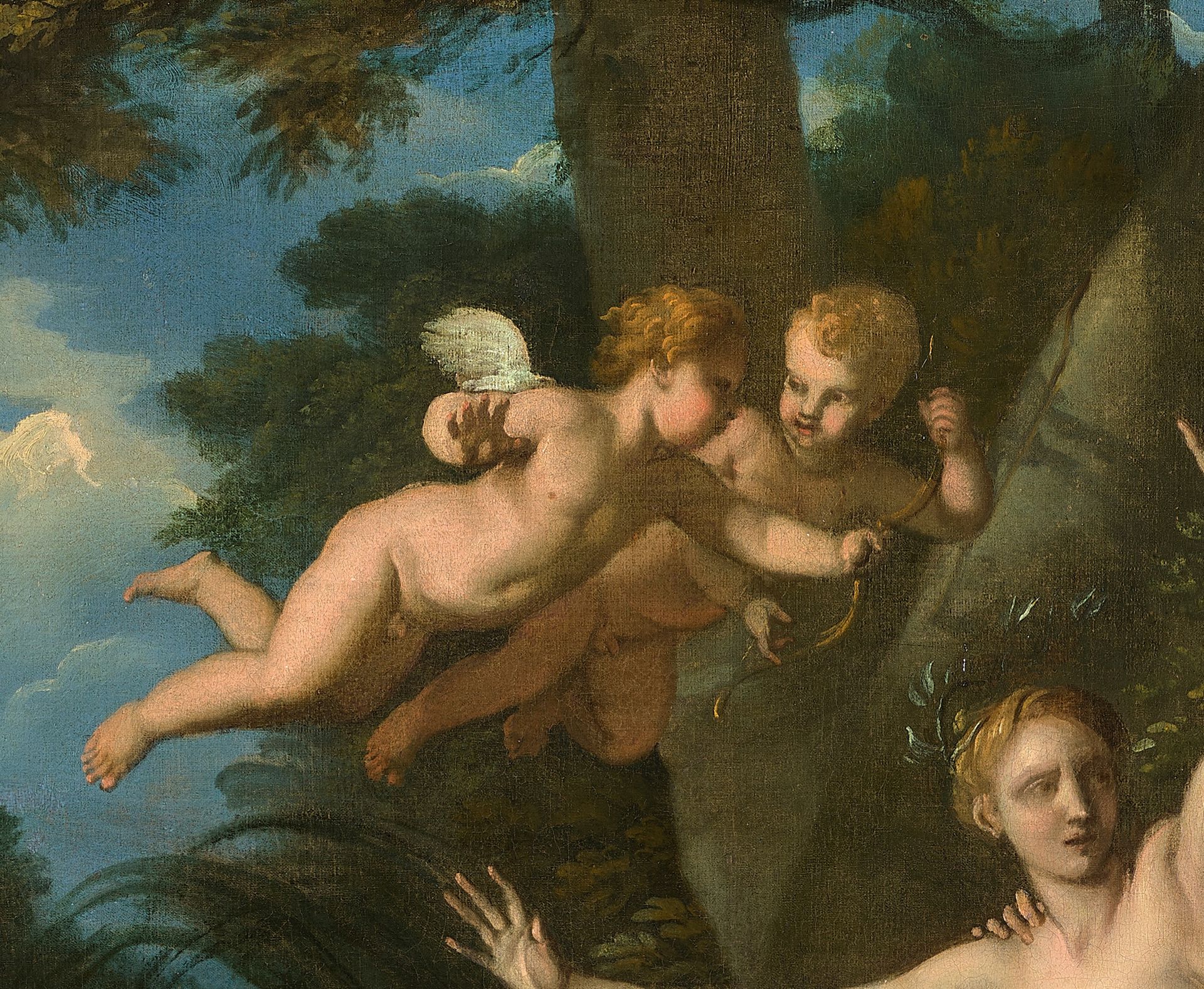 Others were also identified on the art market during the preparation of the Caen museum retrospective. This is the case for a Moses and the Brazen Serpent, of a Sacrifice of Isaac, of a Christ at Emmaus (Ibid., p. 86-87, repr.) or even of a Danae (Ibid., p. 248, repr.). Now, it is precisely to this very rare category – that of the “easel painting” – that our painting belongs. If we also consider the mythological subject in question, this one therefore appears to be the second of its kind to have been found after the Danae (which must in fact be the portrait of a nude woman as Danaë). It is also worth noting a pair of sketches of mythological subjects sold at Sotheby's, whose style is similar to that of our painting (Louis CHERON, Venus and Adonis/Diana and Endymion, signed, canvas, 50.5 x 36.5 cm, Sotheby's London 08/12/2005, lot no. 326) (fig. 1 & fig. 2). Several aspects, in our painting, confirm its classification under the name of Louis Chéron. We note first that Daphne's legs are articulated exactly like those of Hermaphroditus as he appears in one of the drawings in the "Derby Album" of the British Museum (Ibid., p. 95, fig. 100;fig.3. Let us also note the same kind of large, oblique tree trunks without any branching. We can also compare our table to the Danae, which reveals a properly plastic sense just as pronounced. Tightened at the knees, the legs of the Danae move away from each other as you go down towards the feet. One of the putti lying on the ground, in our painting, adopts exactly this strange pose at the level of the legs. The yield of the sky is the other striking common point between the two paintings (a remark which also applies, moreover, to Christ at Emmaus by Louis Chéron cited above), but also with the pair sold at Sotheby's in 2005 (Fig. 1 & Fig. 2). We notice the same type of twilight sky covered with golden clouds. What's more, these clouds are painted with the same sketched touch, the brush following a slightly undulating path. Given the style and the canons of the figures, our painting must be dated around 1720, which saw Louis Chéron at the height of his career with the founding of his own art school.