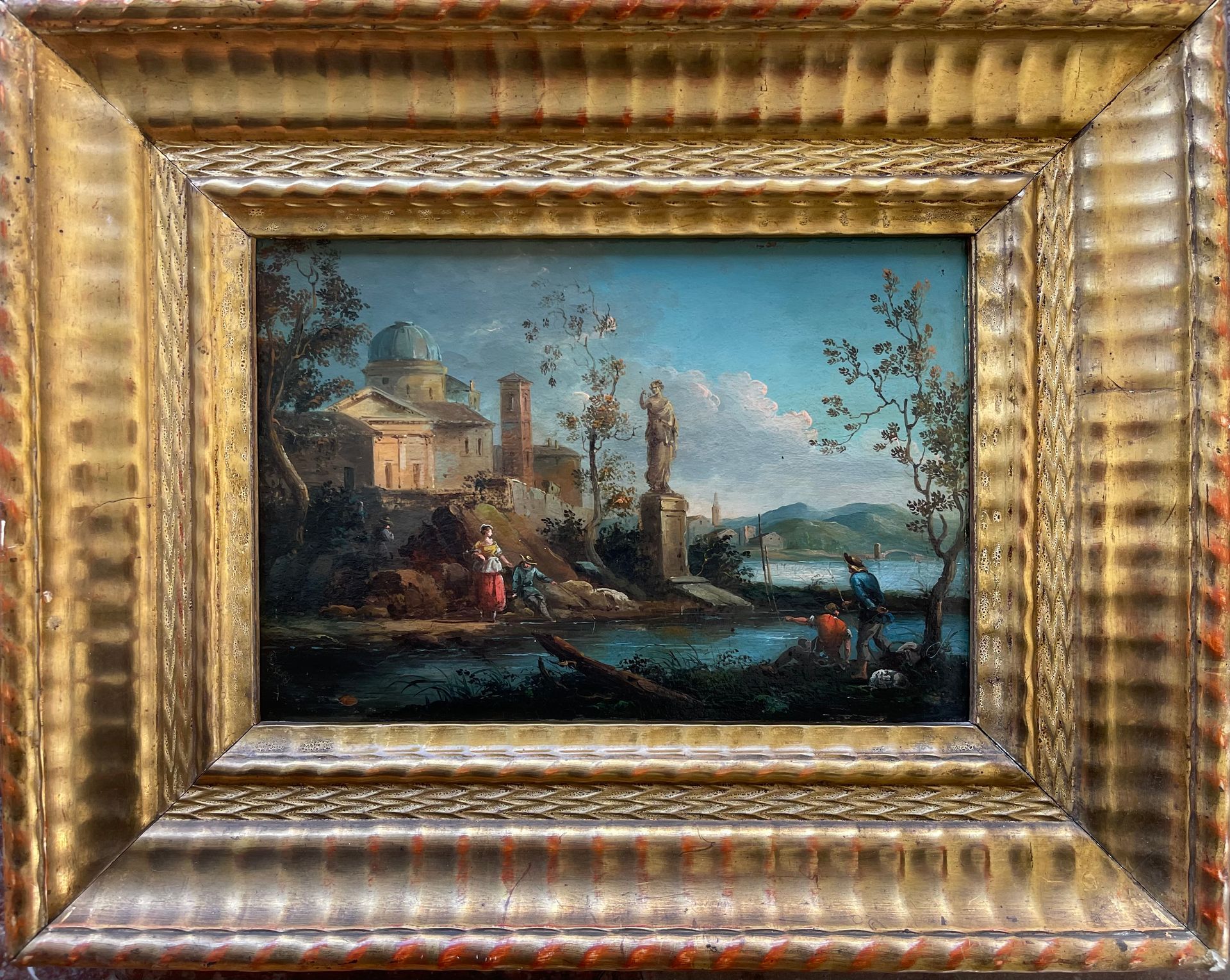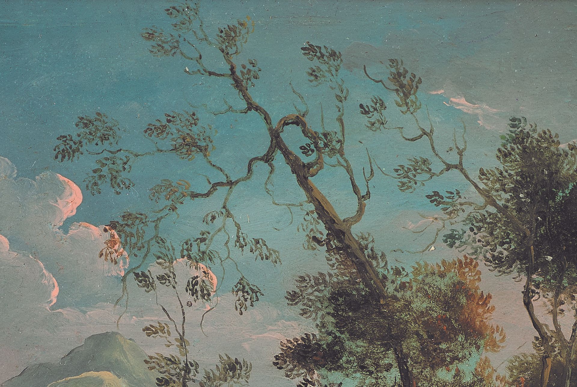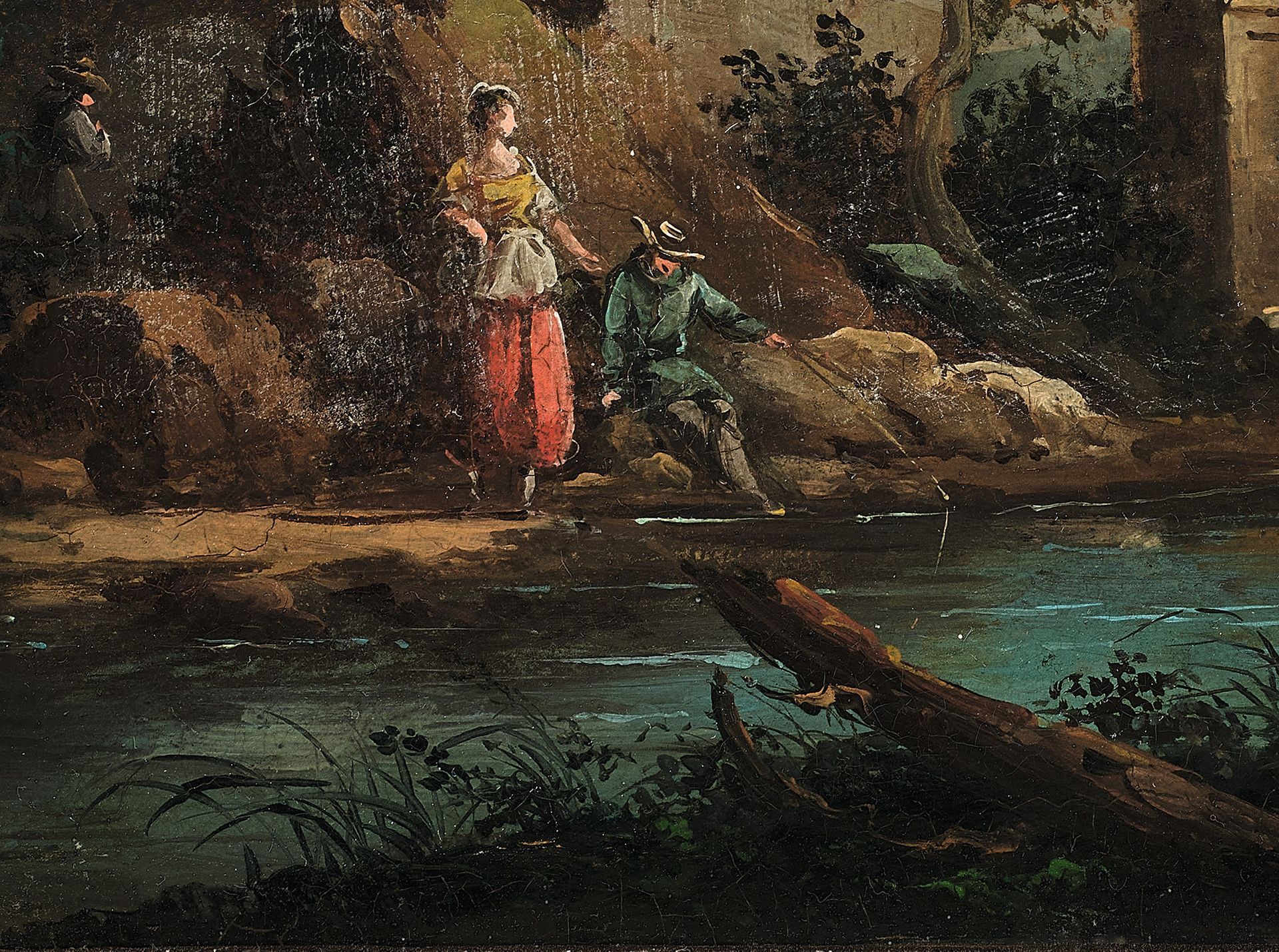 Our naturalistic landscapes seem inspired by RICCI's native countryside, perhaps a view towards the foothills of the Vicenza Dolomites and characters taken directly from reality. We find in this pair of refined brass instruments all the stylistic characteristics of the artist's style, moreover similar to the temperas so familiar in the work of Marco RICCI. The architectures can be compared to A capriccio landscape with a domed church (Sotheby's, July 10, 2014, lot 233), but also the position of the fisherman from behind in A Capriccio with Horses Watering in a River Outside a Walled Town (1720, gouache, 31.6 x 45.6cm, Art Institute Chicago). Furthermore, the characters are in all respects comparable to those in A View in the Veneto (Marco RICCI, canvas, 60.5 x 47.7 cm, Venetian Baroque and Rococo Paintings, London, Walpolle Gallery, June-July 1990).