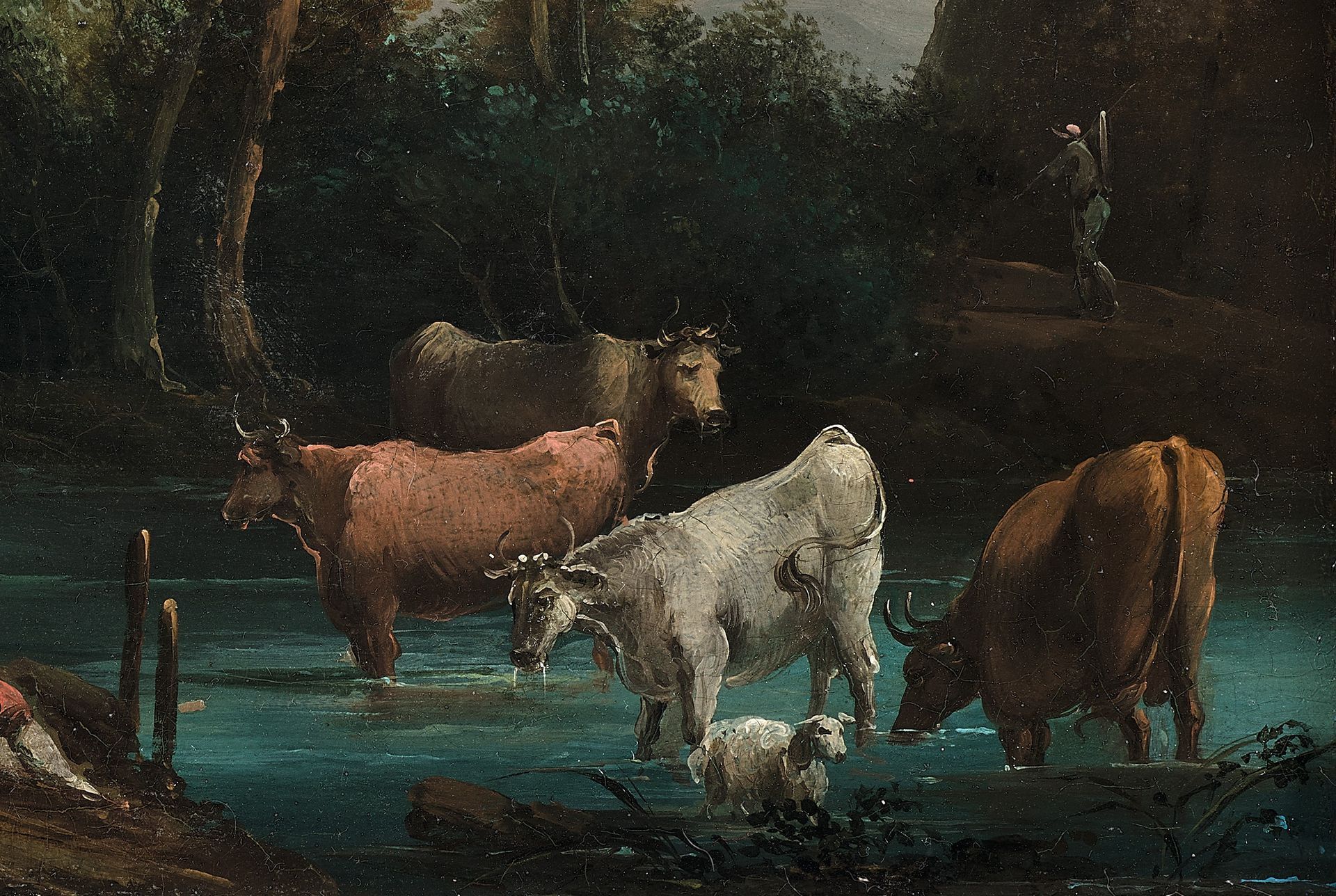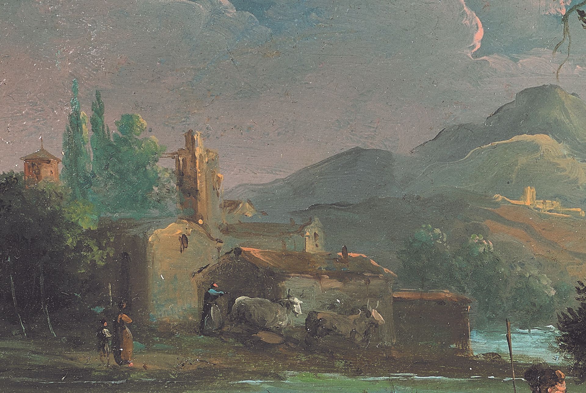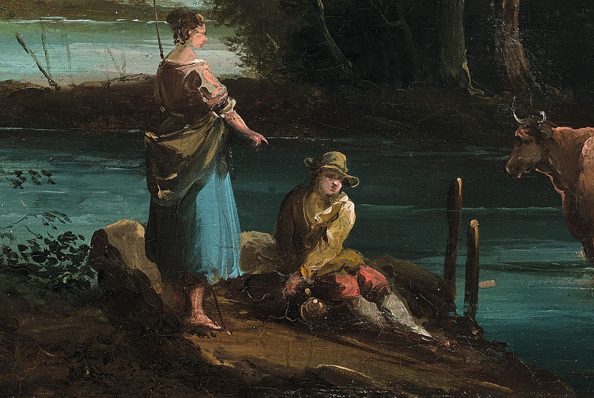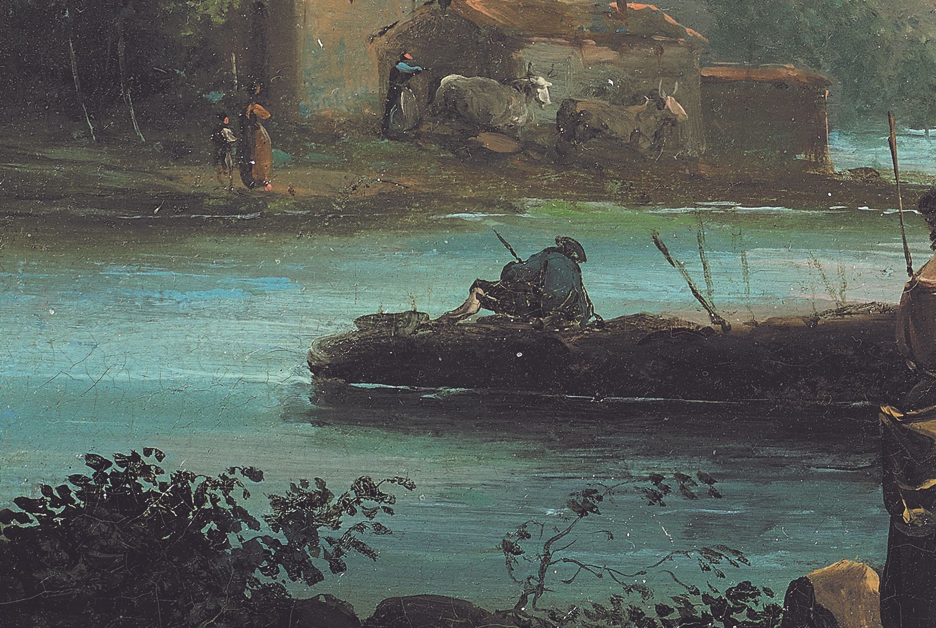 Our naturalistic landscapes seem inspired by RICCI's native countryside, perhaps a view towards the foothills of the Vicenza Dolomites and characters taken directly from reality. We find in this pair of refined brass instruments all the stylistic characteristics of the artist's style, moreover similar to the temperas so familiar in the work of Marco RICCI. The architectures can be compared to A capriccio landscape with a domed church (Sotheby's, July 10, 2014, lot 233), but also the position of the fisherman from behind in A Capriccio with Horses Watering in a River Outside a Walled Town (1720, gouache, 31.6 x 45.6cm, Art Institute Chicago). Furthermore, the characters are in all respects comparable to those in A View in the Veneto (Marco RICCI, canvas, 60.5 x 47.7 cm, Venetian Baroque and Rococo Paintings, London, Walpolle Gallery, June-July 1990).