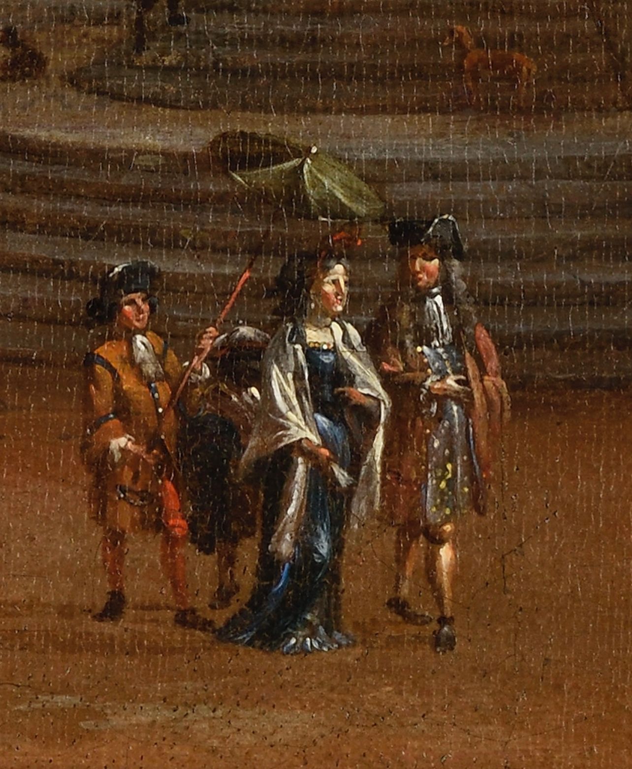 It would seem that in 1670 he traveled with Abraham and then worked in Germany. Jacobus Strock, who is usually attributed (but apparently without any real basis) to a trip to Italy, left a large number of subjects of this kind: these are compositions full of fantasy. The specific animation and all the decorative ingredients of our painting are there united: ancient ruins, brilliant palatial architecture, canoes and ships of all kinds (sometimes of all flags), a picturesque and colorful crowd... details that suggest the cosmopolitan image of an Italian port. Among other singularities concerning the characters of Jacobus, we will also note the assiduity of these elegant couples who strut about on the quays in the midst of sailors and rabble: the rather fat men have a demonstrative gesture. The women invariably wearing fontanges, wear fans and give them their arm. As a good decorator, Storck disseminates architectural quotes, pastiches famous models, amalgamates forms and recomposes the urban landscape according to his own eclectic standards, quite close, it is true, to the Amsterdam taste of the end of the 17th century. The density of the patterns, the warm colors and these great flamed skies in the evening light (or dawn), are very characteristic of the artist's production, with in our painting, the entrance to the building and its double staircase forming a peristyle which is no less singular.