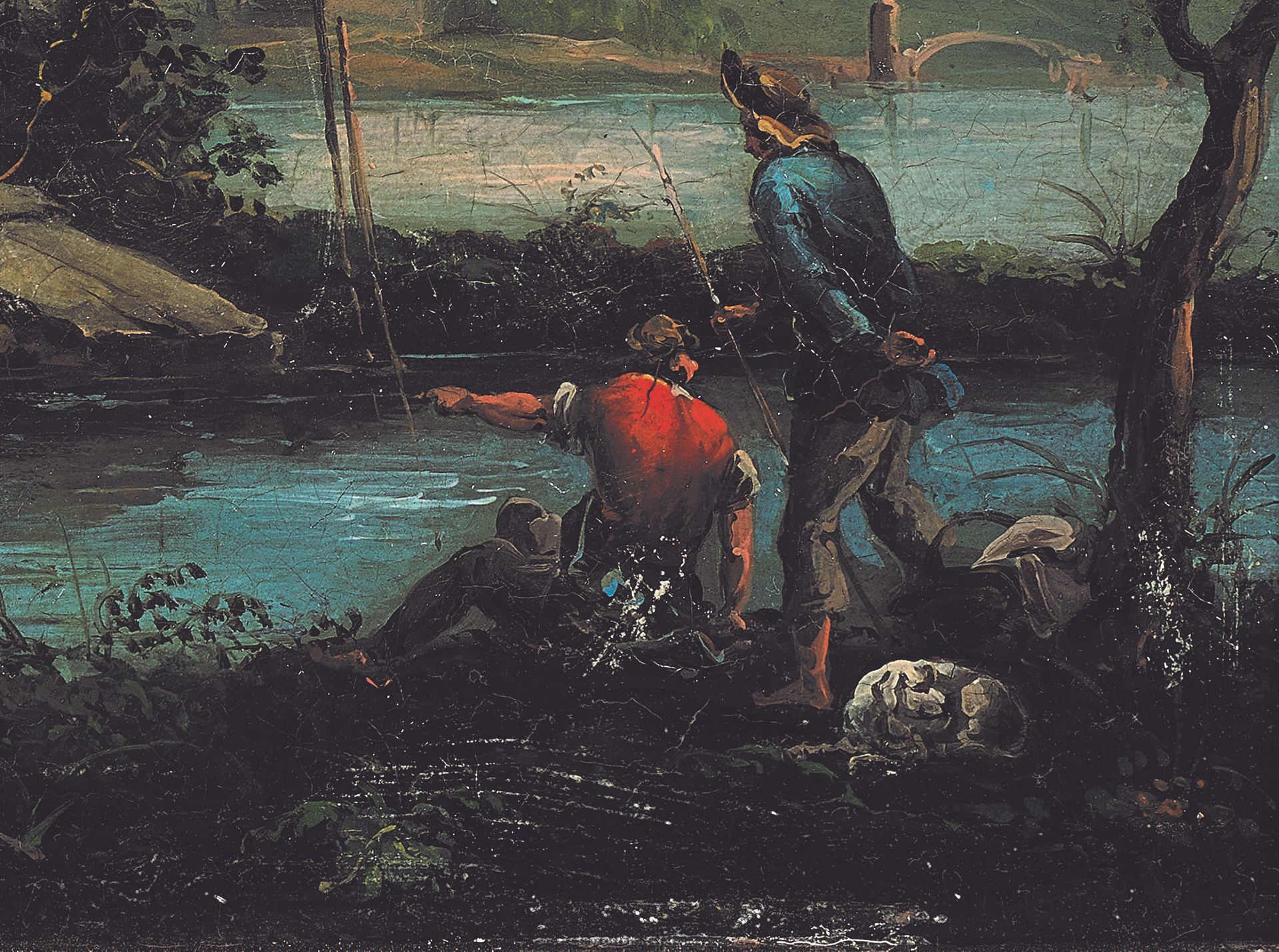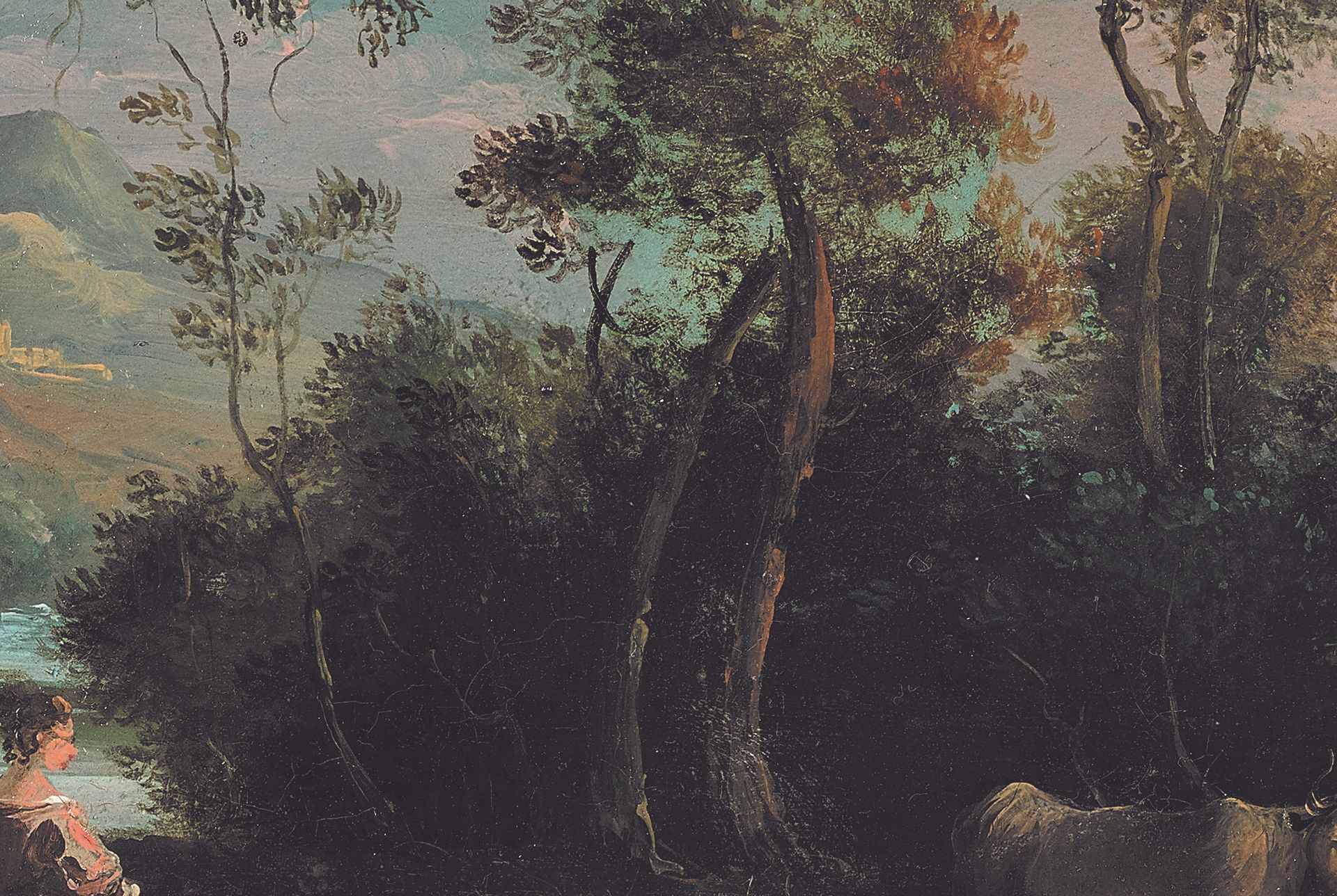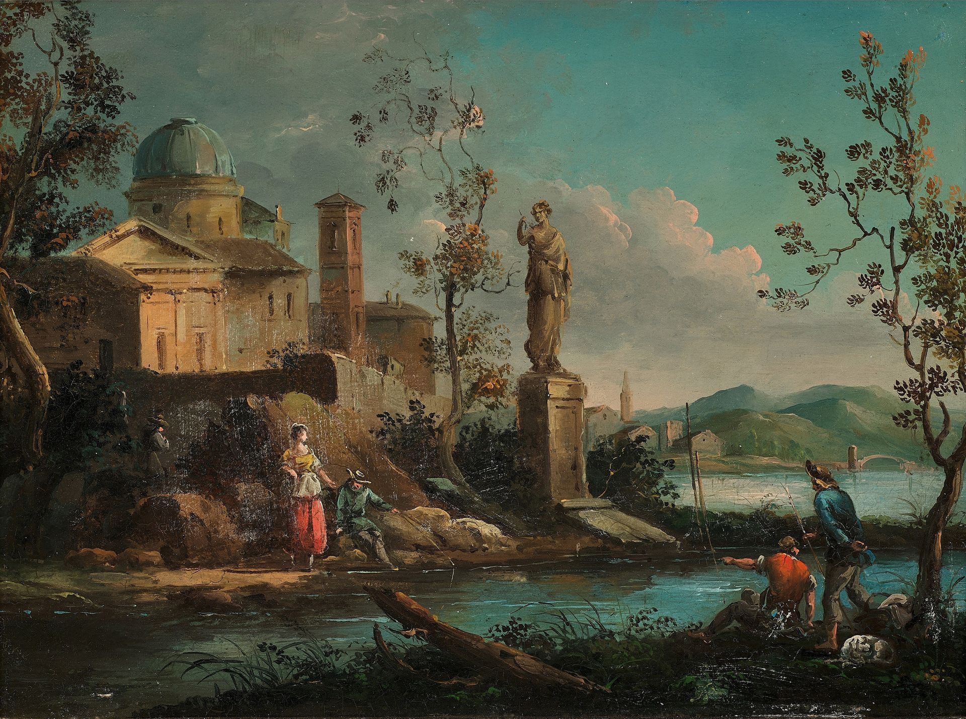 Our naturalistic landscapes seem inspired by RICCI's native countryside, perhaps a view towards the foothills of the Vicenza Dolomites and characters taken directly from reality. We find in this pair of refined brass instruments all the stylistic characteristics of the artist's style, moreover similar to the temperas so familiar in the work of Marco RICCI. The architectures can be compared to A capriccio landscape with a domed church (Sotheby's, July 10, 2014, lot 233), but also the position of the fisherman from behind in A Capriccio with Horses Watering in a River Outside a Walled Town (1720, gouache, 31.6 x 45.6cm, Art Institute Chicago). Furthermore, the characters are in all respects comparable to those in A View in the Veneto (Marco RICCI, canvas, 60.5 x 47.7 cm, Venetian Baroque and Rococo Paintings, London, Walpolle Gallery, June-July 1990).