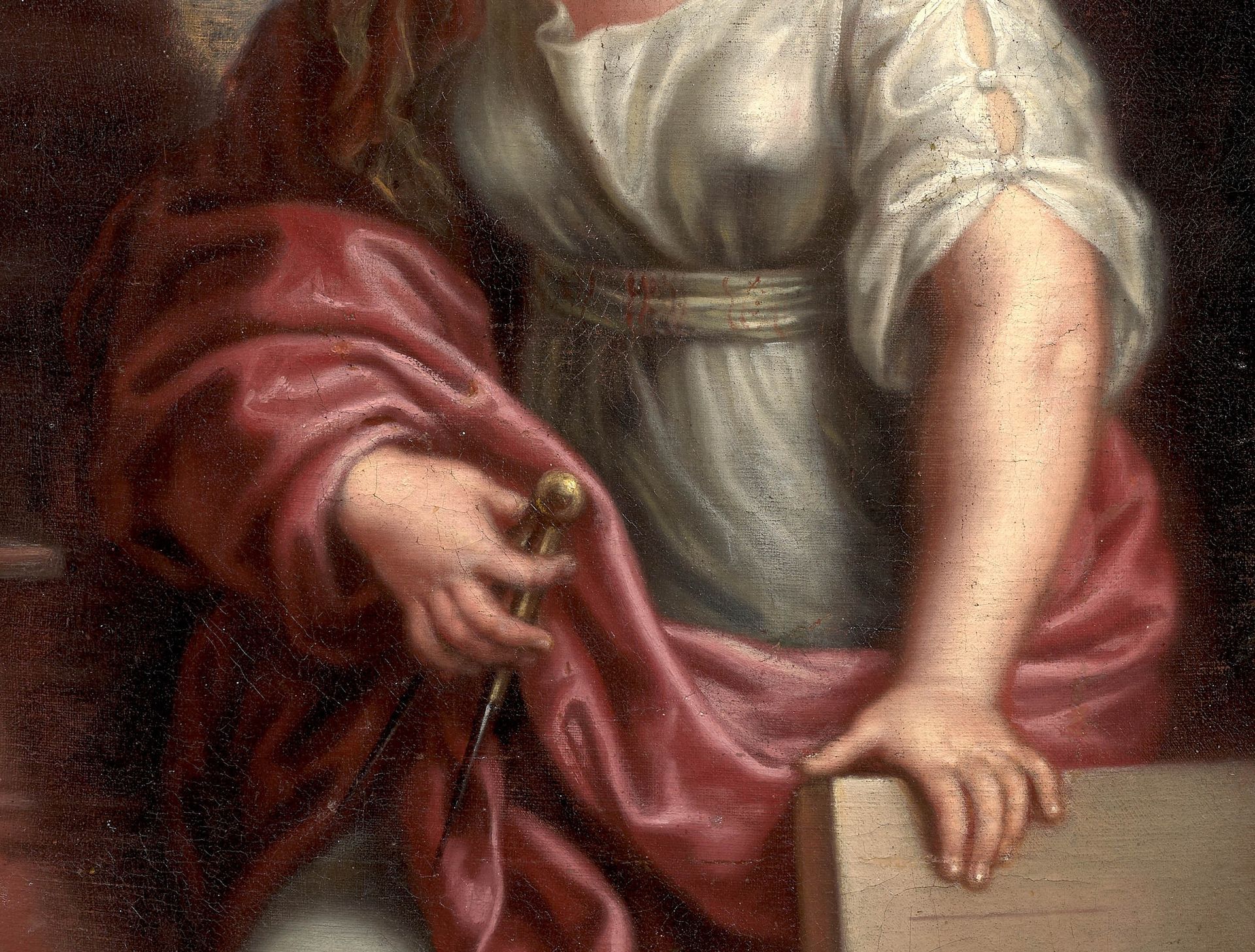 In reality, the artist had painted pure allegories in the antechamber of the queen's apartments, but their location always made them discreet. Each of the spandrels shows, in fact, in the form of personifications, Diligence, Vigilance, the Academy, and Commerce. It should be noted in passing that the painting representing Aspasia conversing with the philosophers, in the same room, shows nothing other than a Greek geometer (probably Euclid) with his tablet; the idea is not far removed from that of our painting... But the most remarkable thing is the participation of Michel II Corneille, around 1683, in the famous painted decoration of the "Cabinet of Fine Arts" by Charles Perrault. The concept of modernity being dear to the commissioner, the old idea of the liberal arts had been erased in favor of the "modern" arts. Thus Optics painted by Corneille (lost but known from the engraving), actually appeared as the modernization of Astronomy (Urania). Now, it is obvious that the very subject of our painting returned to the "conservative" spirit of the liberal arts of which Geometry and Arithmetic were part. If we use the verb "to return", it is because the resolutely light tone of our painting contrasts with the majority of the works of Michel II Corneille conceived up to the 1680s. If our painting therefore belongs to the late phase of his production, the question of its destination remains mysterious. Should we imagine that Michel II Corneille would have entirely conceived, for the room of some wealthy individual, a cycle devoted to the liberal arts? If so, could it have constituted, at the heart of the famous quarrel opposing "Ancients" and "Moderns", a response to Perrault's enterprise? Another hypothesis deserves to be taken into account. Knowing Corneille's leading role at the Gobelins factory from 1684 onwards, he could have attempted to create a tapestry cartoon on the theme of the liberal arts. If so, he would certainly have rivaled Noël Coypel, the author of the cartoon representing Grammar among the Liberal Arts (Paris, Mobilier National; on deposit at the Musée du Grand Siècle, Saint-Cloud). The reappearance of other paintings by Corneille related to this commission will perhaps allow us to learn more.