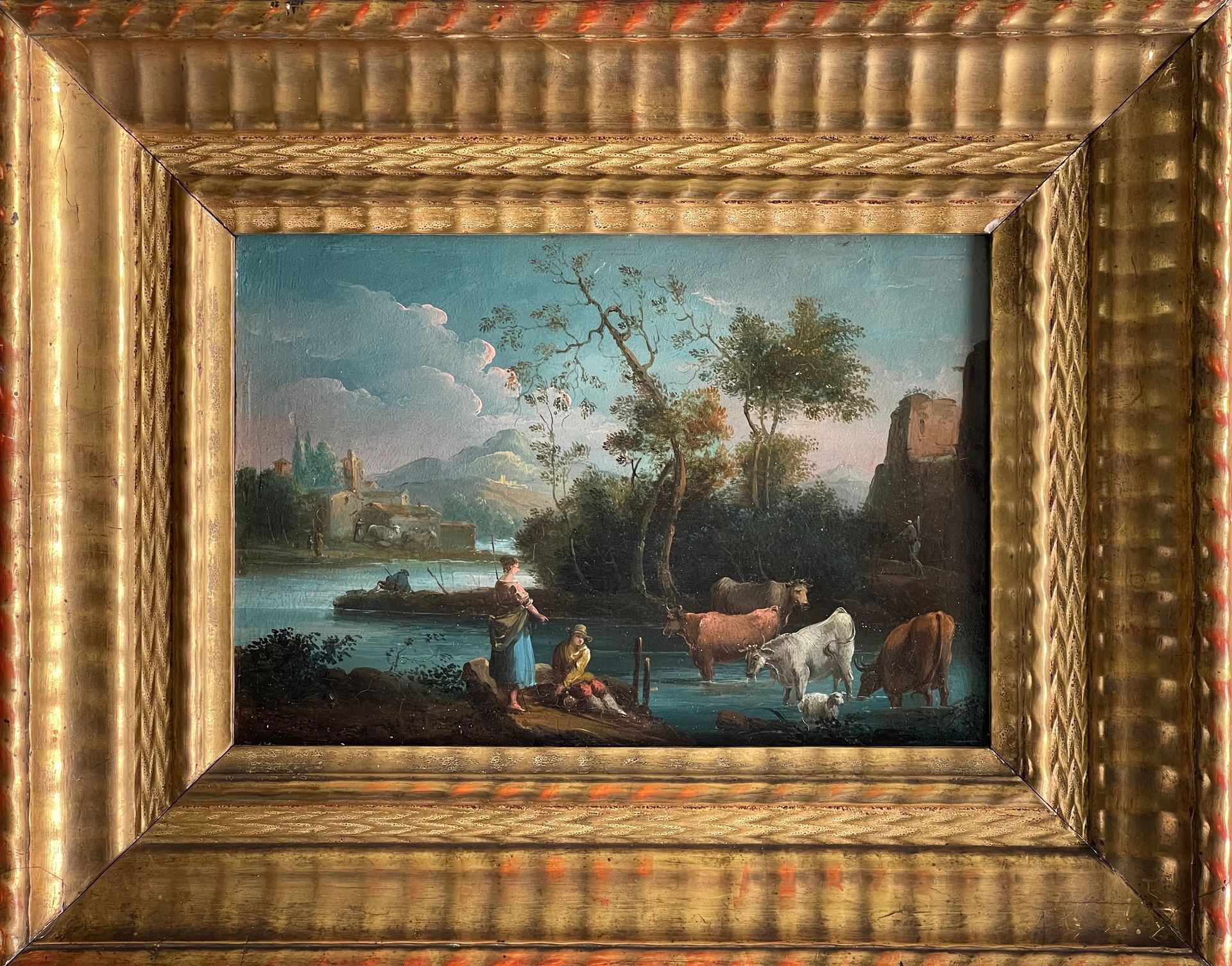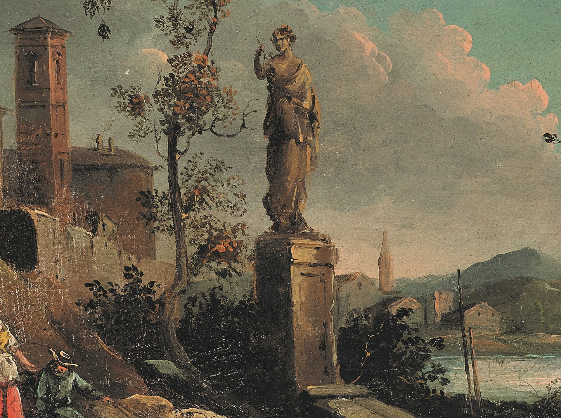 Nos paysages naturalistes semblent inspirés de la campagne natale de RICCI, peut-être une vue vers les contreforts des Dolomites de Vicenze et des personnages directement tirés de la réalité. L’on retrouve dans cette paire de cuivres raffinés toutes les caractéristiques stylistiques de la manière de l’artiste, d’ailleurs similaires aux temperas si familières dans l’œuvre de Marco RICCI. Les architectures sont à rapprocher de A capriccio landscape with a domed church (Sotheby’s, 10 juillet 2014, lot 233), mais aussi la position du pêcheur de dos dans A Capriccio with Horses Watering in a River Outside a Walled Town (1720, gouache, 31,6 x 45,6cm, Art Institut Chicago). Par ailleurs les personnages sont en tous points comparables à ceux de A View in the Veneto (Marco RICCI, canvas, 60,5 x 47,7 cm, Venetian Baroque and Rococo Paintings, Londres, Walpolle Gallery, juin-juillet 1990).
