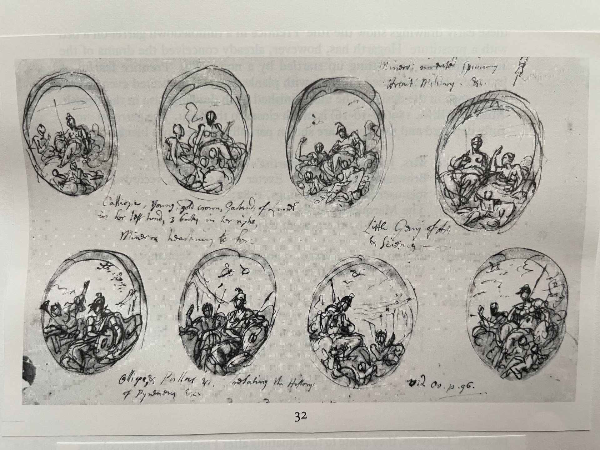 Dans les deux cas, les dessins sont exécutés à la plume et au lavis et portent de nombreuses inscriptions. Le sujet semblerait être Minerve fréquentée par les Arts. Thornhill devait les utiliser dans trois commissions décoratives distinctes : à Garfield Hall dans l’Essex, à Thornhill Park près de Stalbridge et à Headley Park dans le Hampshire.