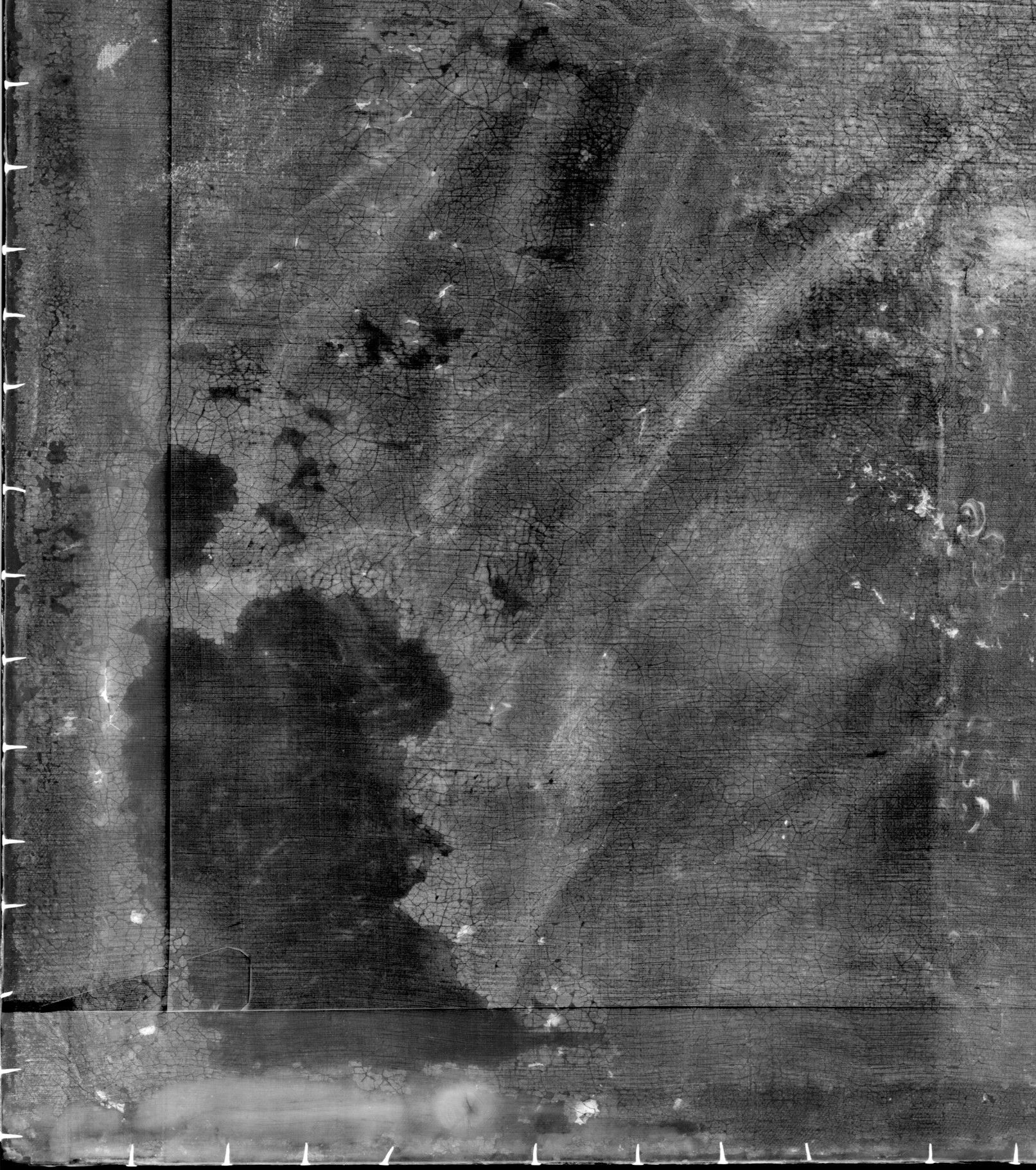 - La radiographie du tableau (fig. 12) fournit des informations non visibles sur les images infra-rouge, notamment sur le bas et à gauche de la composition : l’on y découvre la composition originale sous la couche supérieure de peinture noire, des drapés présents ainsi qu’une lacune dans l’angle gauche (fig. 13). La nature des drapés diffère de celle observée dans les trois autres variantes de la composition peintes postérieurement à Anvers. Ils sont d'ailleurs majoritairement constitués de bleu de smalt, pigment régulièrement utilisé par Van Dyck.