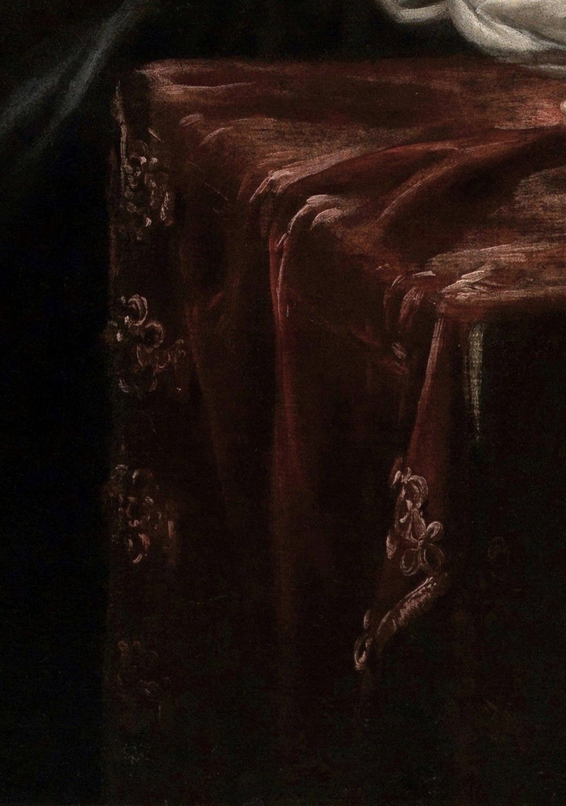 En 2017, une probable quatrième version fut publiée, la Vierge à l’Enfant (Musée Cerralbo, Madrid) (fig. 30)[xvii], œuvre remettant en question la chronologie établie et qui paraît encore plus précoce que notre peinture. Longtemps considérée à tort comme attribuée à Mateo Cerezo, nous avons tenté de démontrer qu’elle serait selon toute probabilité la première version de la composition peinte à Gênes dès l’arrivée de l’artiste vers 1621. Les analyses scientifiques s’y rattachant ont démontré que les couches picturales mises en évidence par des prélèvements correspondent aux techniques pratiquées par Van Dyck en Italie, mais aussi la trame de la toile dont la chaîne est composée de dix fils verticaux/neuf fils horizontaux au centimètre carré, correspondant aux toiles utilisées par Van Dyck à Gênes (Roy, Bulletin technique n°20, 1999, Londres, National Gallery, Yale University Press)[xviii].