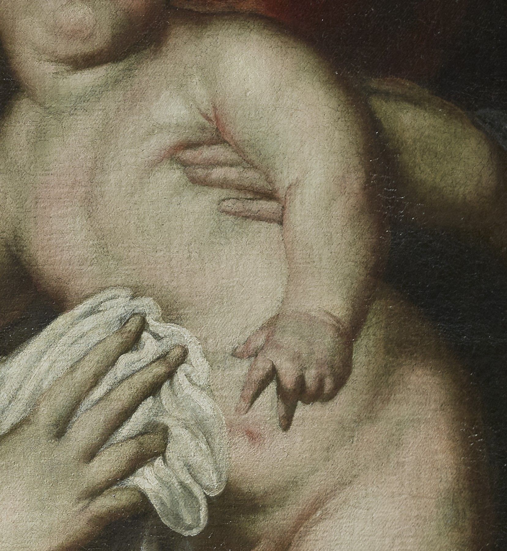 In working out the shape of the figure’s proper left foot, the painter has clearly made small adjustments to the toes, trying to place the Child so that the feet and legs are convincingly balanced. An image taken during cleaning reveals a shift in the position of the toes, while in both visible and IR images, the reserve above the foot is clearly visible. »