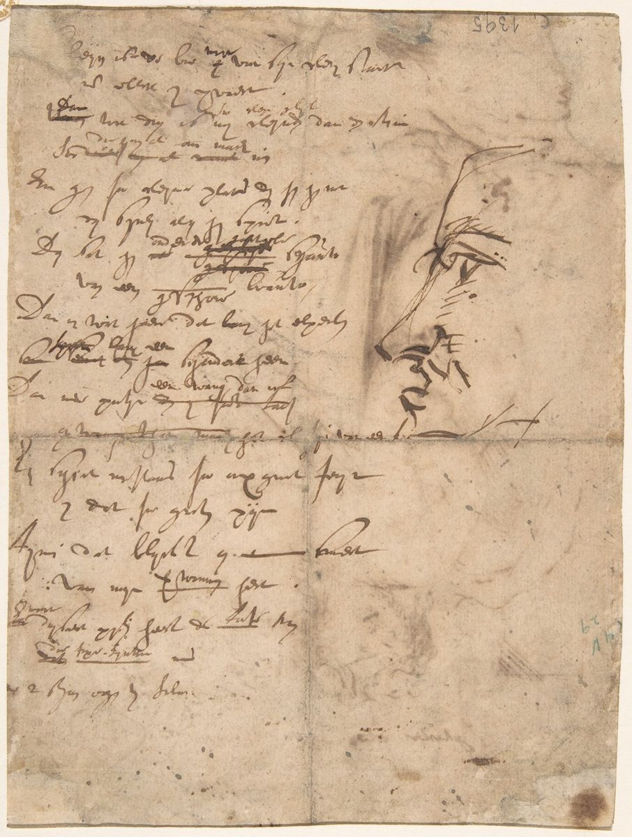 La Vierge à l’Enfant mène à un troisième dessin à mettre en relation avec la composition et répertorié comme d’après Van Dyck : Étude de l'Enfant Jésus et de la main de la Vierge Marie, recto[vi], plume et encre brune, 18,7 x 13,9 cm (d’après Van Dyck, Metropolitan Museum, New York, inv. 1975.131.177) (fig. 4). Au verso un Poème et une esquisse de visage possible d’une autre main (?) (fig. 5). Ledit dessin était classé en 1928 par A. Mos comme de Pierre Paul Rubens (A. Mos, Amsterdam, 7/8-11-1928, nr. 520, P.P. Rubens) pour être postérieurement déplacé justement vers l’œuvre de Van Dyck[vii]. Il y a tout lieu de s’interroger sur cette feuille conservée aujourd’hui au Metropolitan et dont l’on ne sait que peu de choses, pour toutes les raisons visibles et que nous ne saurions développer ici. Comment ne pas imaginer un travail préparatoire, une étude approfondie dudit dessin permettrait probablement de répondre à cette question.